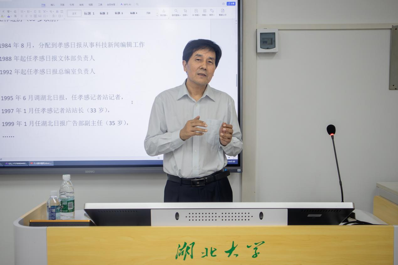 2025年9月18日,全国优秀新闻工作者、前湖北日报传媒集团编委、编辑出版中心主任胡祥修应邀走进公司融合新闻学课堂,为2023级新闻学和视听传播学专业带来题为“新时期,需要什么样的新闻传播人才”的主题讲座。