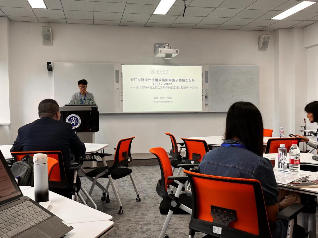 此次论坛共设置5个分论坛,分别为“中华文明精神标识与文化精髓”、“文明交流互鉴与中华文明海外影响力”、“中华文明国际传播的多元化与在地化”、“智能传播与国际传播能力建设”、“东北亚及周边传播研究”。在“智能传播与国际传播能力建设”分论坛中,公司2021级研究生王家欢宣读了其与胡洁老师共同合作的论文《长江文明海外传播效果影响因子的组态分析》,在场专家对该论文研究方法的规范性与研究思路的合理性给予了肯定。