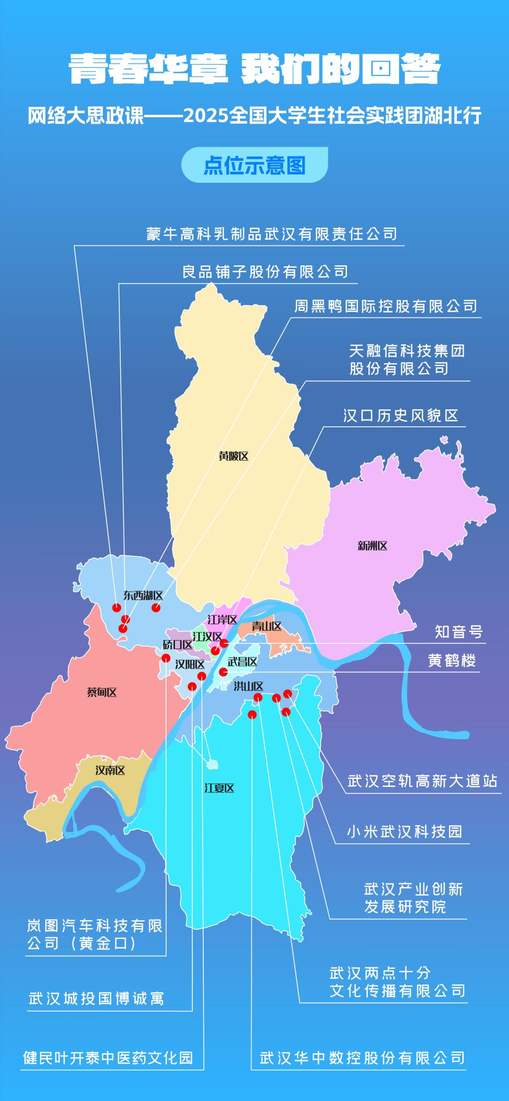 “青春华章·我们的回答”网络大思政课——2025全国老员工社会实践团湖北行调研点位示意图
