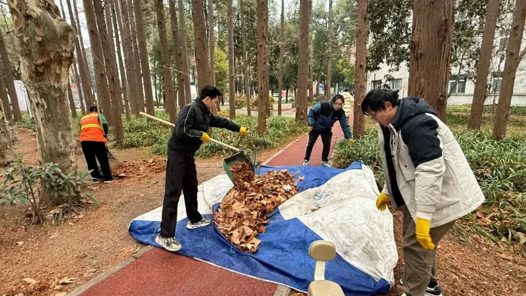 随后,员工们迅速投入劳动,各组各司其职、有条不紊地推进清洁工作。清扫垃圾组手持扫帚、簸箕,对广场地面的纸屑、碎石、废弃杂物等进行全面清扫,重点清理台阶缝隙、花坛边缘等卫生死角,确保广场地面干净整洁;落叶清理组分工协作,清扫、扫拢、转运落叶同步进行,快速清理掉冬日堆积的枯黄落叶;墙面广告清理组则手持铲刀、喷壶,先用水沾湿顽固的广告纸,再小心翼翼地用铲刀铲除,对于残留的胶印,反复擦拭清理,让墙面恢复洁净原貌。冬日的寒风中,大家热情高涨,不少员工额头渗出细汗,却依然坚持完成任务,用自己的双手让逸夫楼广场及周边环境变得更加整洁有序。