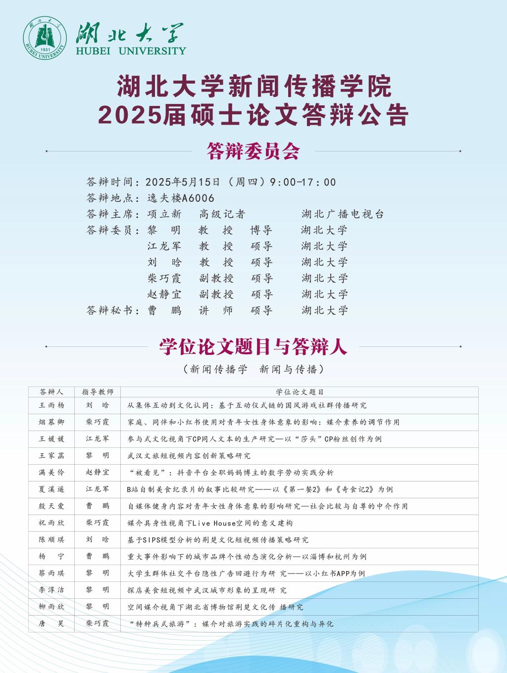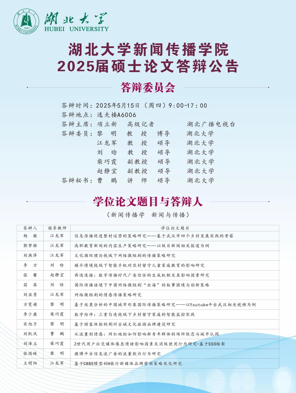 英国威廉希尔WilliamHill2025届硕士论文答辩公告(第三组)