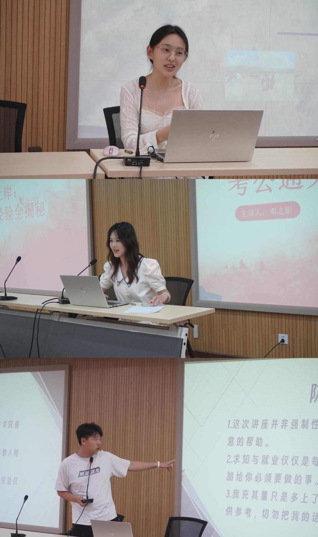 此外,2021级播音与主持艺术专业刘治江、邓之影分别就“简历设计与投递技巧”“考公考编备考策略”作专项分享,内容涵盖简历结构化排版、岗位需求匹配度提炼、考编信息获取渠道等实用内容。现场互动环节,员工围绕“如何高效找实习”“考编面试应答技巧”等问题积极提问,老师、员工及学长学姐逐一解答,氛围热烈。